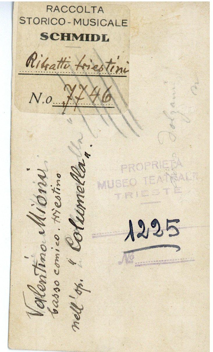 In costume in "Columbella". Allievo del m.° G. A. Scaramelli. Una locandina del Teatro Galimbeni di Vigevano riporta una serata a beneficio del basso comico assoluto Valentino Mioni il giovedì 10 febbraio 1870 ( in rassegna stampa triestini)