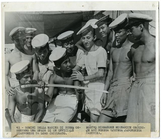 Marinai inglesi osservano la spada di un ufficiale giapponese appena catturato