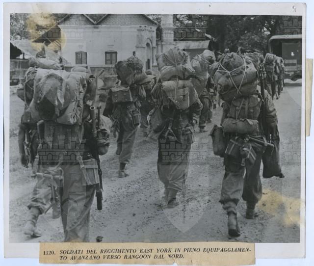 Soldati del reggimento East York avanzano verso Rangoon dal nord