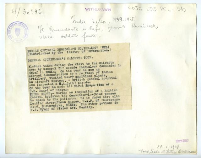 Visita del Generale Claude Auchinleck, comandante in capo in India. La foto rappresenta la visita all'ospedale da parte del generale ai pazienti.