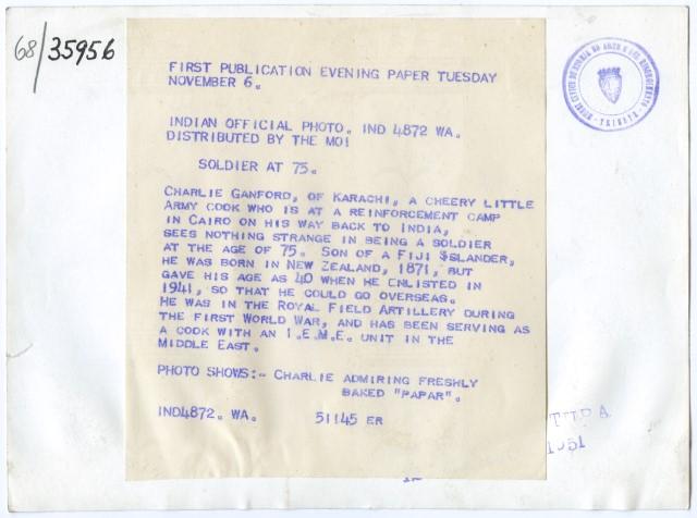 La foto rende omaggio a Charlie Ganford, di Karachi, cuoco che, dopo aver lavorato presso il Cairo, tornato in India, svolge l'attività di soldato all'età di 75 anni. Nato in Nuova Zelanda, nel 1871, nel 1941 si iscrive alle liste di leva, affermando di averne 40.