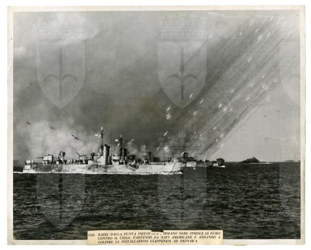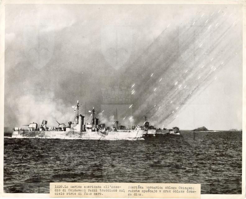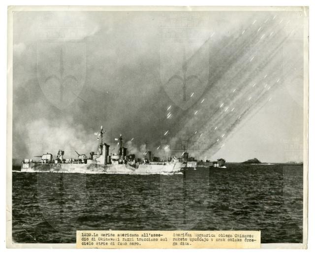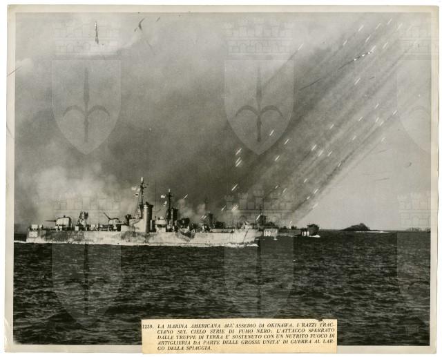 Lancio di razzi americani contro navi giapponesi durante la battaglia di Okinawa.