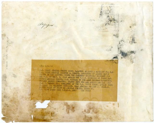 Sulla nave «Missouri», attraccata nella baia di Tokyo, il 01/09/1945, il comandante della Marina americana Chester W. Nimitz firma il documento della resa del Giappone.