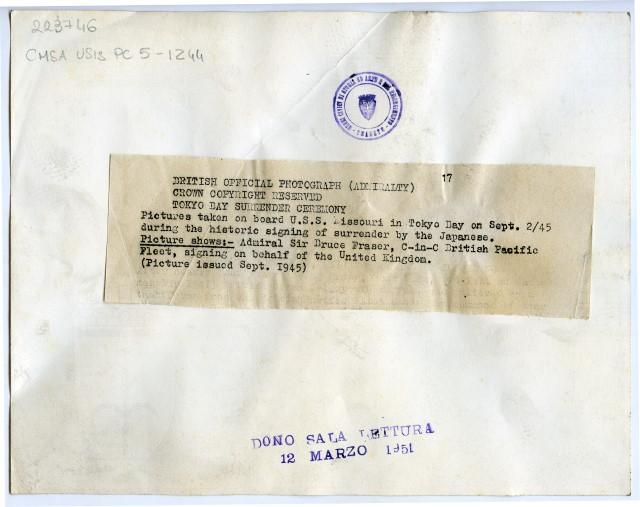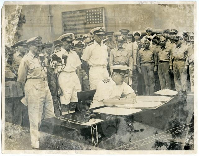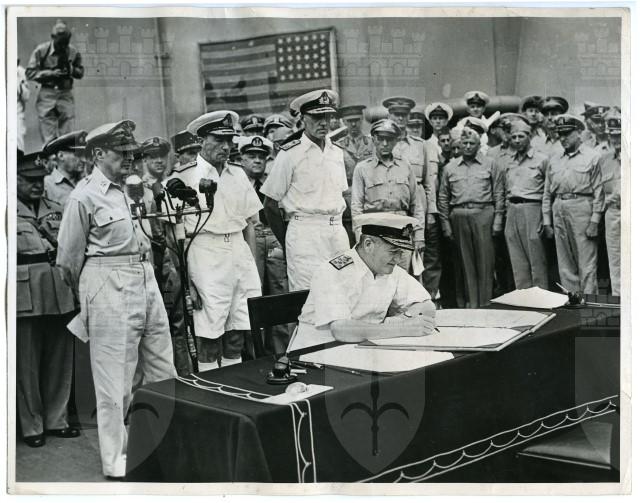 L' ammiraglio Bruce Fraser, firma la resa giapponese il 2 settembre 1945 a bordo della nave Missouri attraccata nella baia di Tokyo.