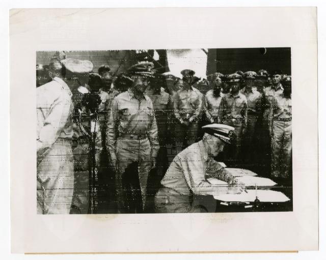 L'Ammiraglio Chester W. Nimitz firma i documenti della resa del Giappone sulla nave Missouri nella Baia di Tokyo, nel settembre del 1945.