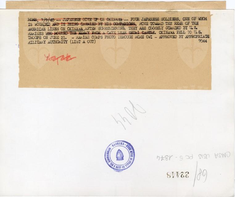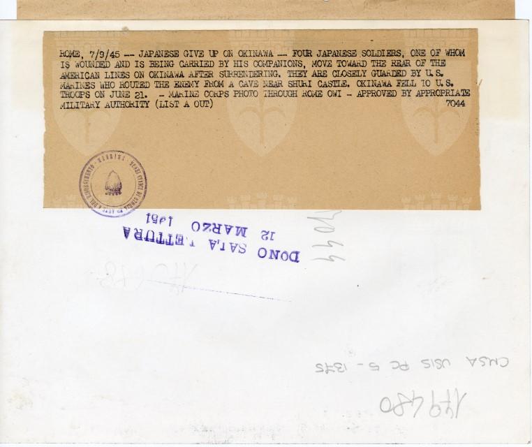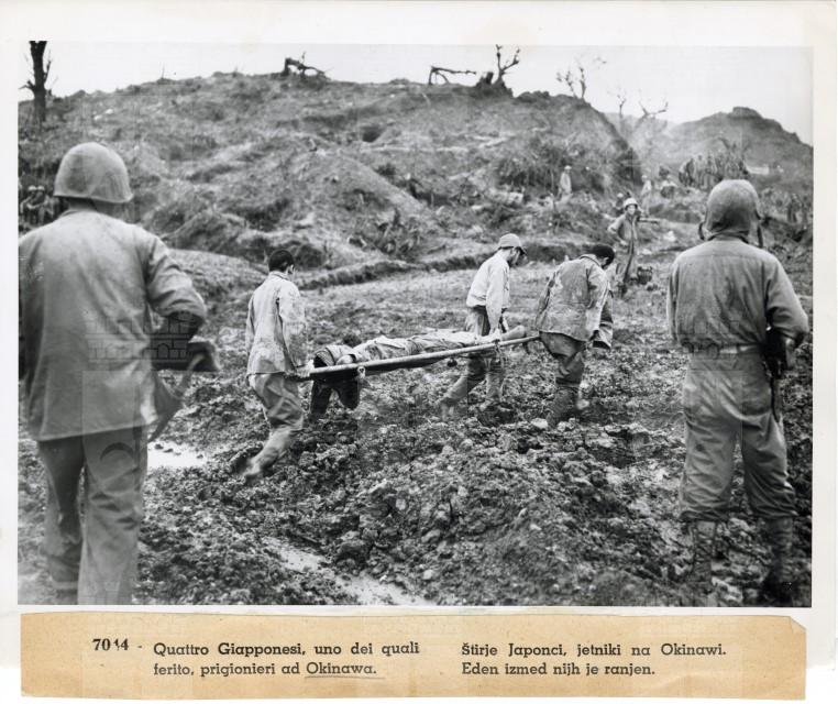 Soldati giapponesi, fatti prigionieri ad Okinawa, trasportano un loro commilitone ferito.