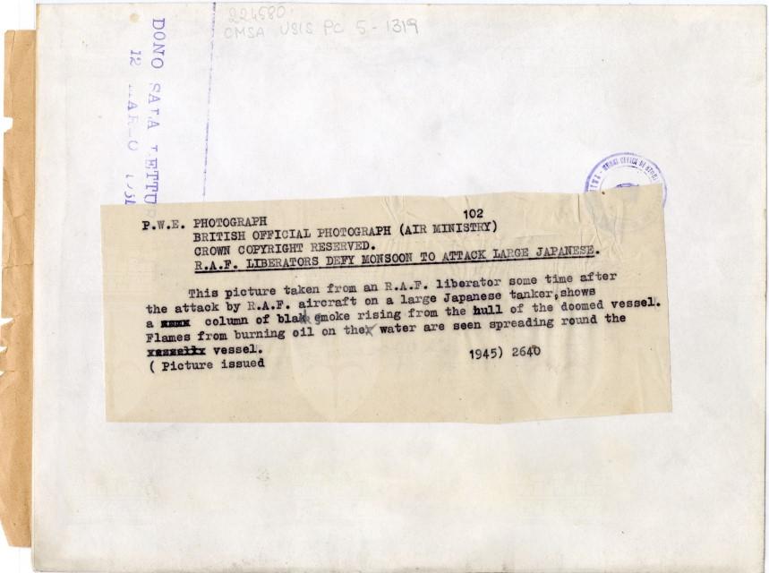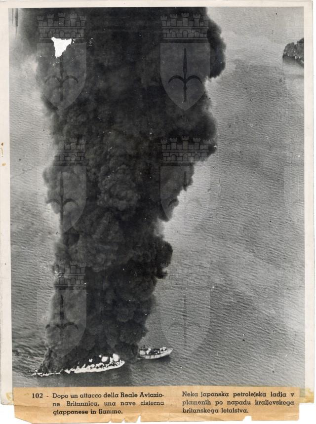 Veduta aerea di una nave giapponese in fiamme a seguito di un bombardamento da parte dell'Aviazione britannica