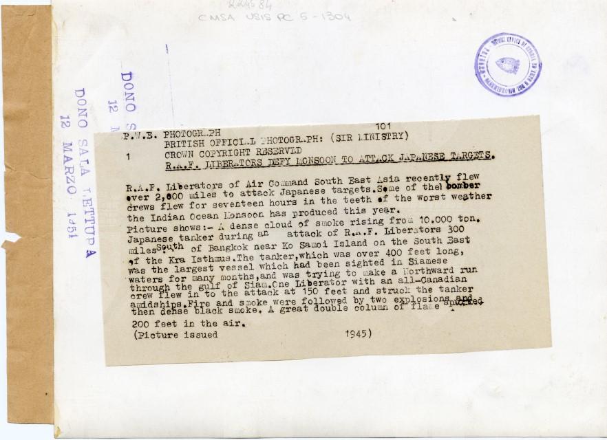 Veduta aerea di una nave giapponese in fiamme a seguito di un bombardamento da parte dell'Aviazione britannica