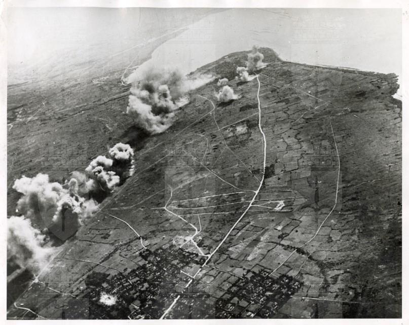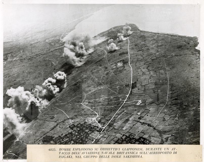 Veduta aerea di un attacco dell'Aviazione britannica sull'aeroporto di Isjigaki, isola del gruppo delle Sakishima, avvenuto nel giugno 1945.
