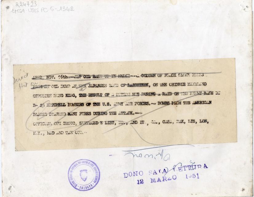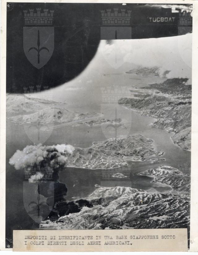 Incendio proveniente da un deposito di lubrificanti giapponesi a seguito di un attacco aereo americano ad Hong Kong.