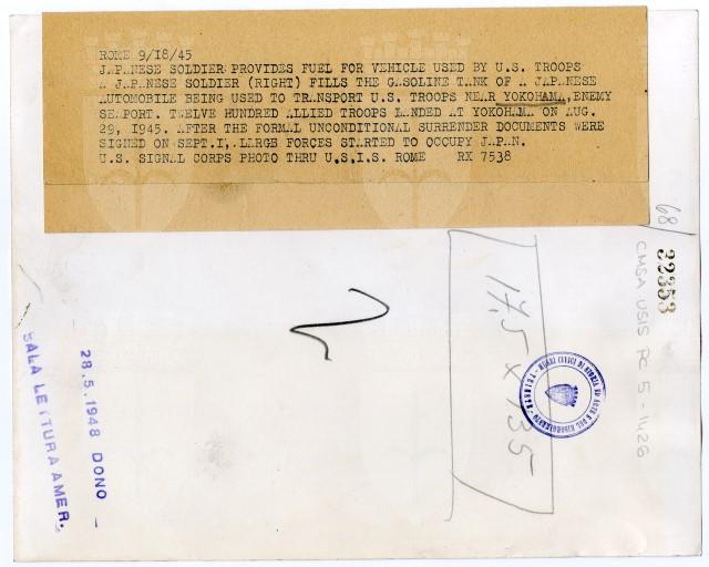 Un soldato giapponese riempie il serbatoio di un'automobile, che servirà al trasporto delle truppe americane.
