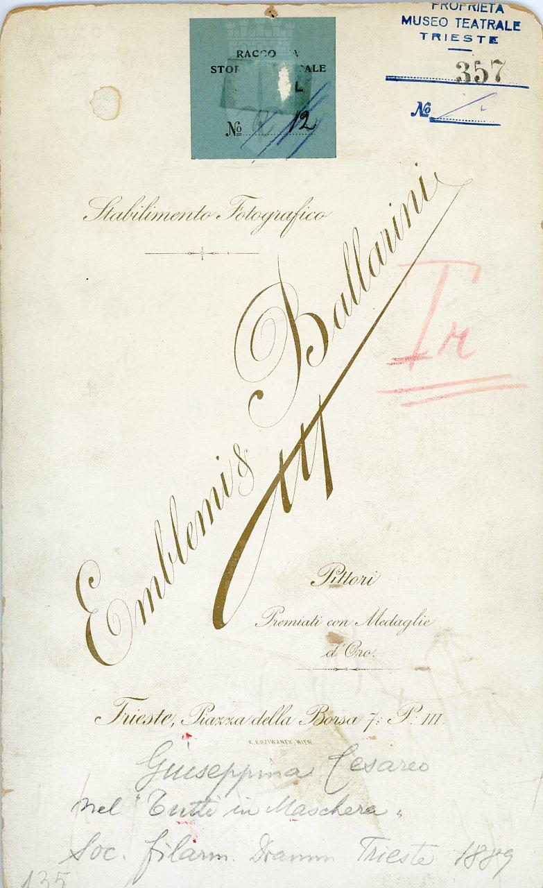 In costume. Cantò nel 1889 alla Soc. Filarmonico Drammatica di Trieste "Tutti in maschera" e nel 1898 "Tannhauser" al teatro Comunale