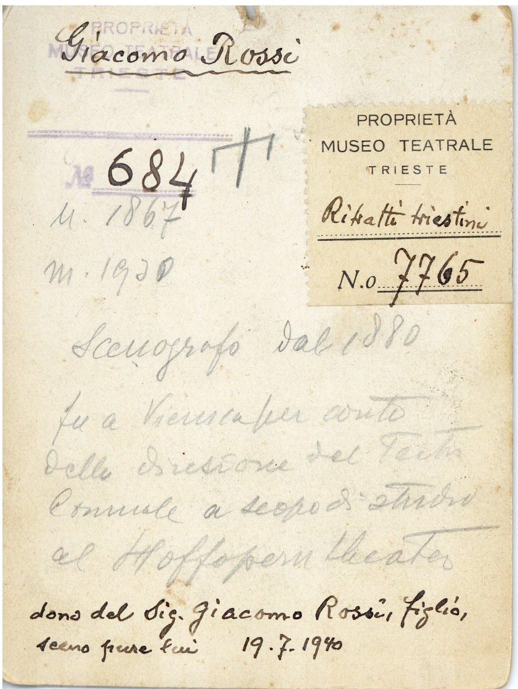 Proprietà Ente pubblico territoriale; Civico museo teatrale C. Schmidl; donazione; Giacomo Rossi; 1940/07/19