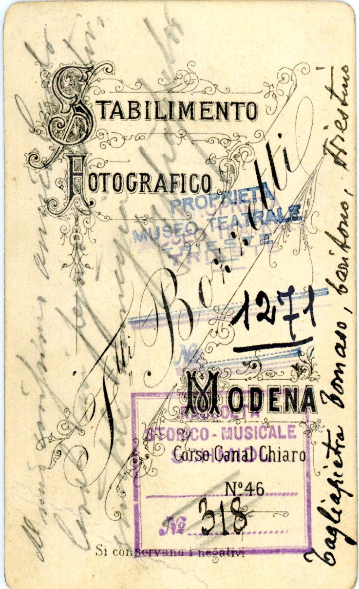 In costume nel ruolo di Alfonso in "La favorita", interpretata anche a Vigevano e Zara nel 1872; nel 1875-76 a Nizza ha interpretato Laerte in "Mignon" e Valentino nel "Faust; l'anno successivo Nevers, negli "Ugonotti" a Genova. A Trieste ha partecipato al concerto del 31.3.1872 diretto da Giuseppe Rota al Teatro Comunale