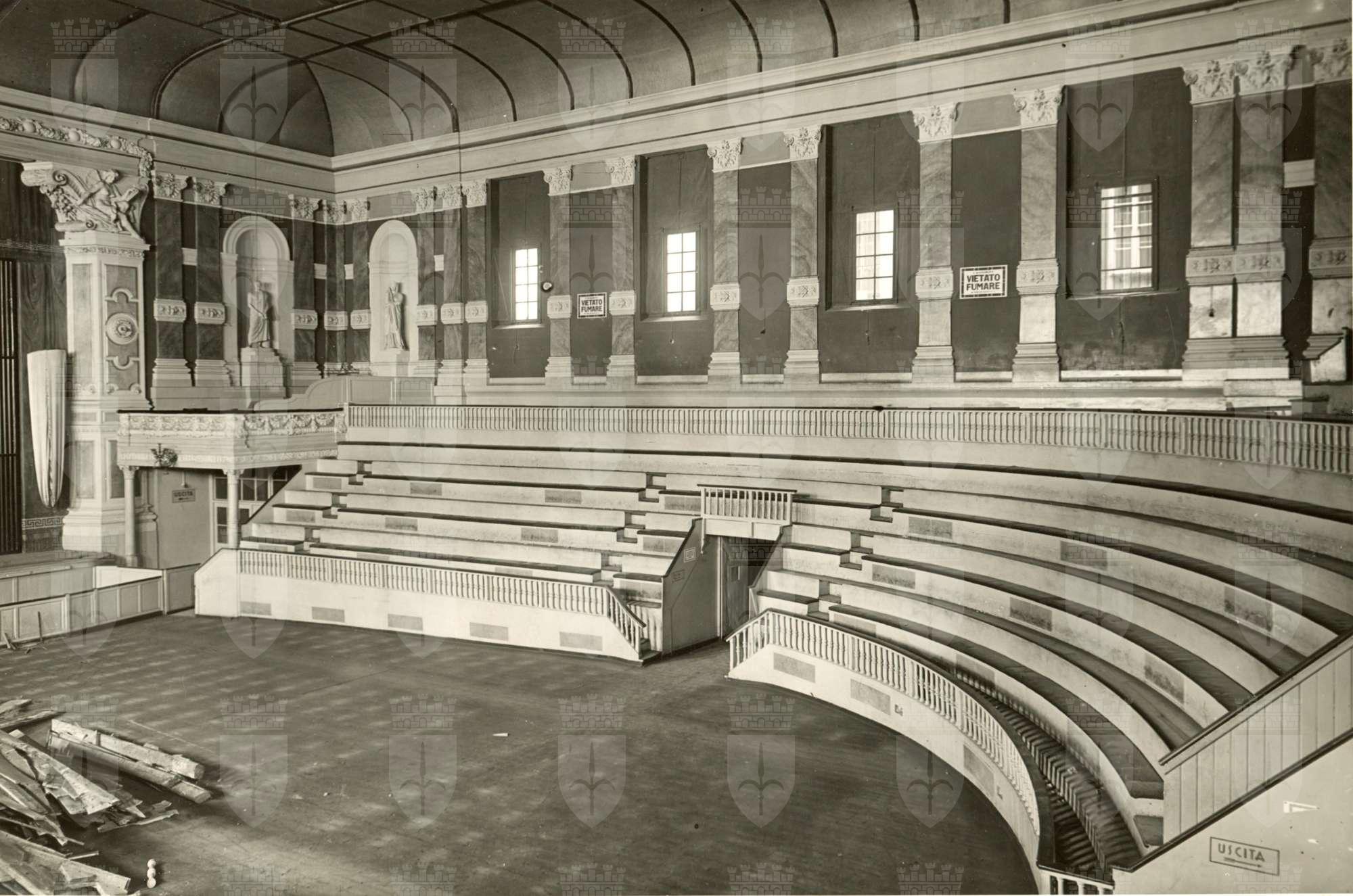 Interno della sala del Teatro Fenice di Trieste, durante i lavori di restauro del 1937. Particolare della platea con le sedie rimosse