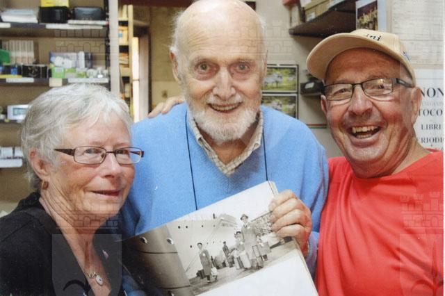 Borsatti nel suo laboratorio in posa con i due coniugi raffigurati nel libro che tiene in mano e che erano in partenza per l'Australia con la motonave Castel Verde