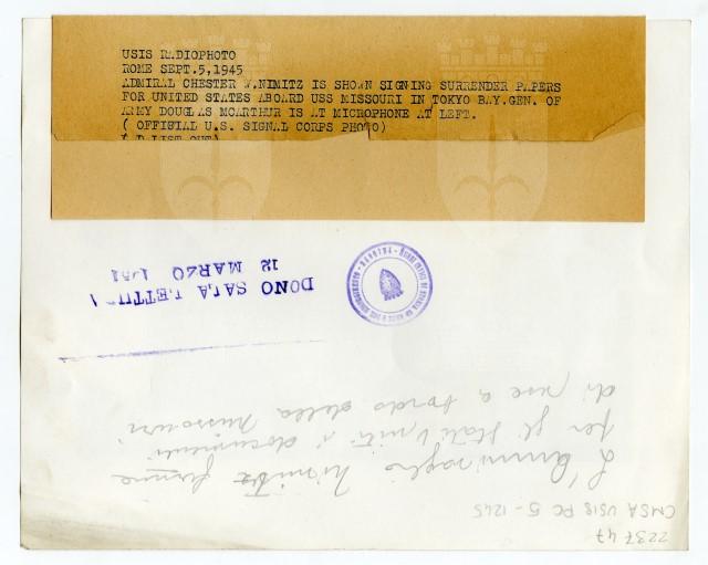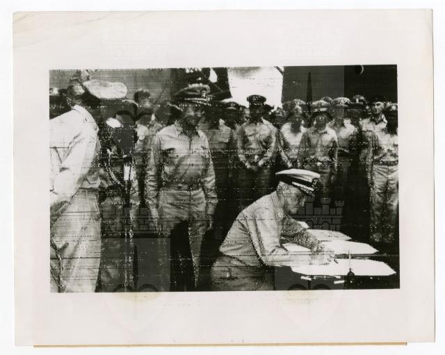 L'Ammiraglio Chester W. Nimitz firma i documenti della resa del Giappone sulla nave Missouri nella Baia di Tokyo, nel settembre del 1945.