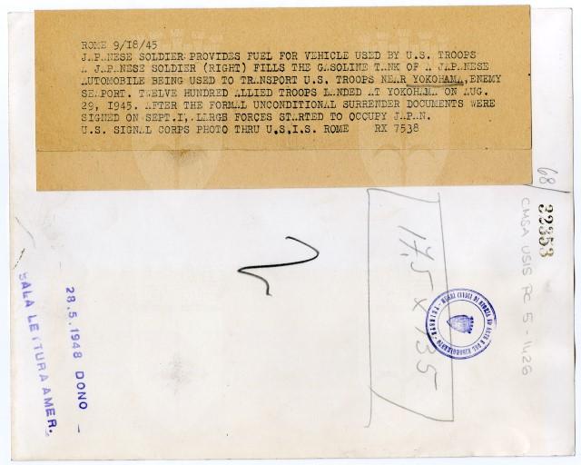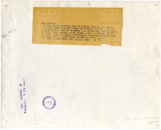 Un soldato giapponese riempie il serbatoio di un'automobile, che servirà al trasporto delle truppe americane.