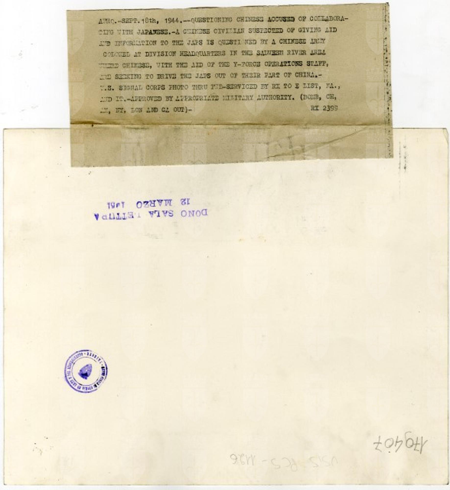 Questioning Chinese accused of collaborating with Japanese. A Chinese civilian suspected of giving aid and information to the Japs is questioned by a Chinese army colonel at divisin headquarters in the Salwee river area (...)