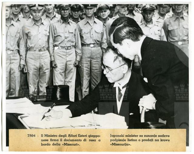 Il Ministro degli Affari Esteri giapponese Mamoru Shigemitsu firma i documenti di resa del Giappone nel settembre 1945.