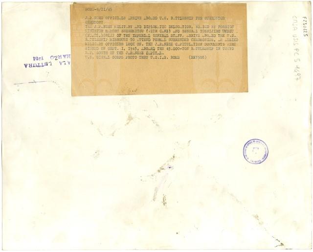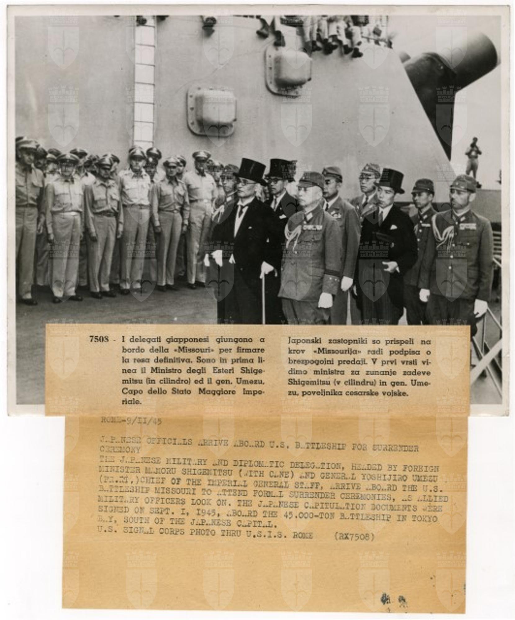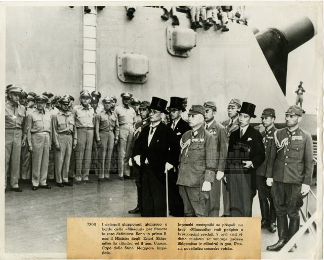 La delegazione giapponese, guidata dal Ministro degli Affari Esteri Mamoru Shigemitsu e dal Generale Yoshijirō si trova sul ponte della nave americana Missouri per firmare la resa del Paese nel settembre 1945.