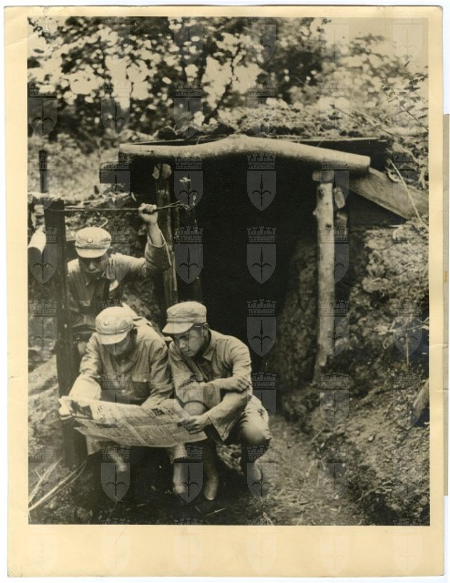 Chinese officers relax in former Japanese defence position