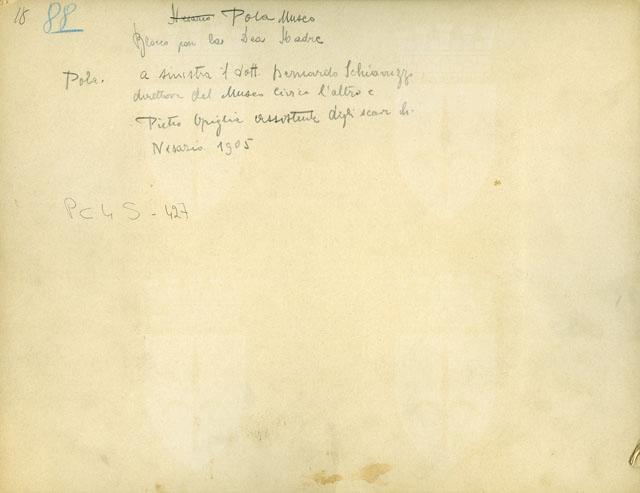 Pietro Opiglia con Bernardo Schiavuzzi (Pirano 1865-Pola 1929), direttore del museo di Pola, nel 1903 davanti al frontone del cosiddetto tempio di Eia, trovato a Nesazio e trasportato a Pola nel museo.