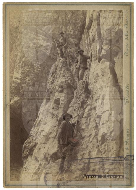 Tre grottenarbeiter (lavoratori delle grotte) su un sentiero attrezzato con scale di corda nella Grande Voragine (Velika Dolina) di San Canziano. Alla base della scala, in primo piano, è ritratto Joze Cerkvenik, una delle prime guide delle Grotte.