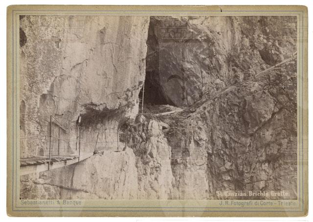 Veduta del sentiero scavato nella roccia nella Piccola Voragine (Mala Dolina) delle Grotte di San Canziano con, al centro l'ingresso della Caverna Brichta. Sulla sinistra si nota una parte del Ponte della Concordia con la pavimentazione in tavelle di legno.
