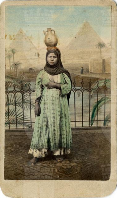 Alle spalle della giovane portatrice d'acqua fondale con due piramidi e palme