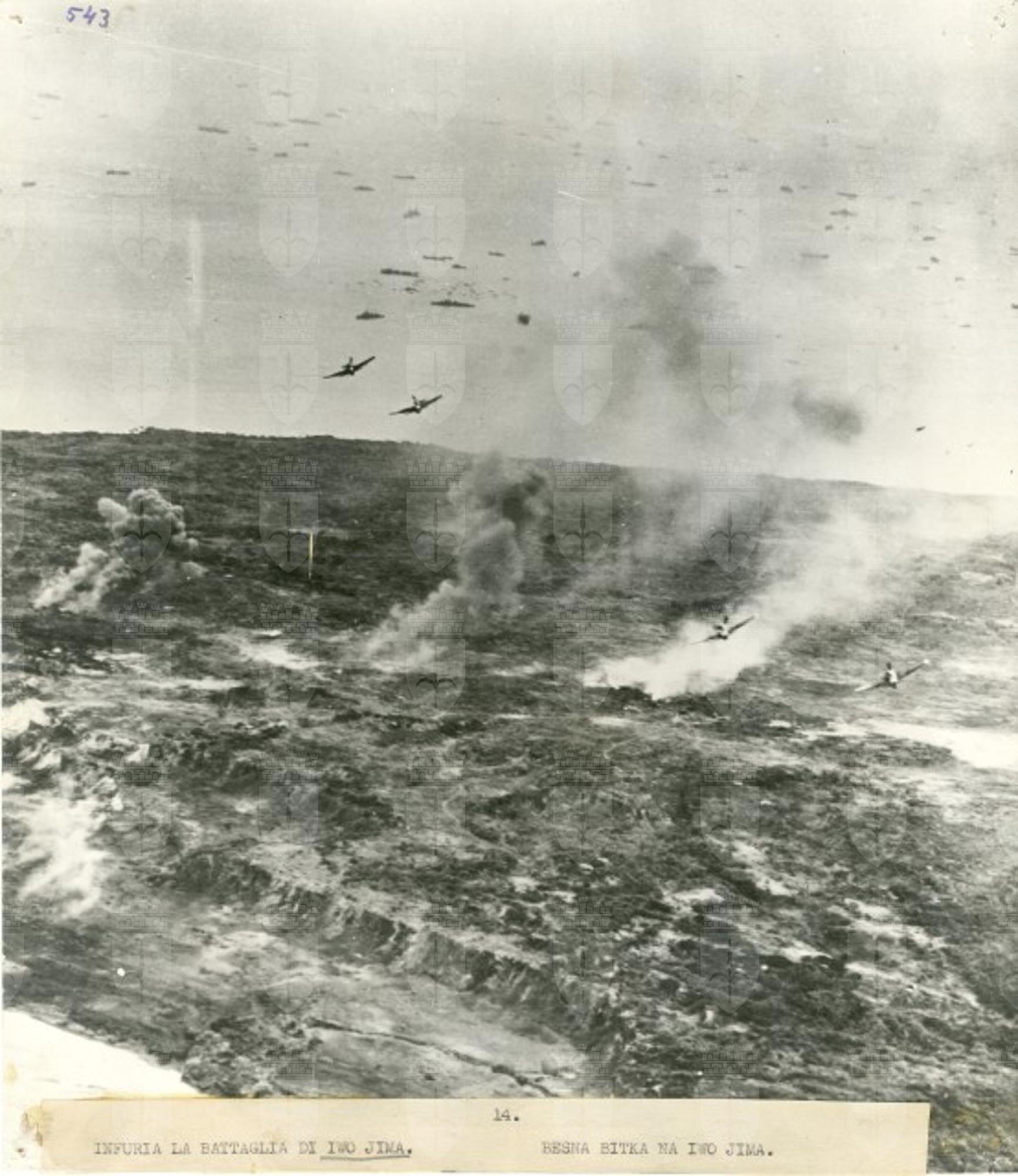 Bombardamento aereo sul territorio di Iwo Jima. Visibili alcuni aerei militari americani