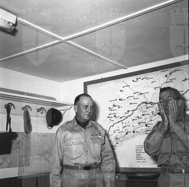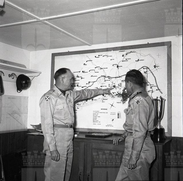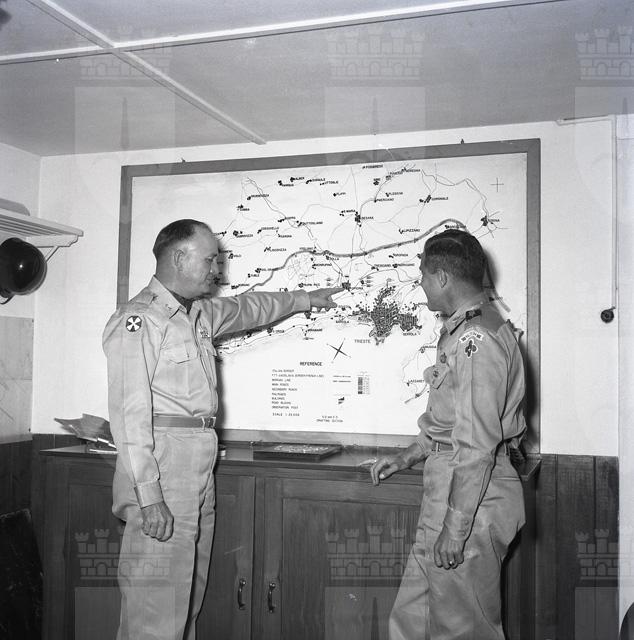 Il generale John A. Dabney, comandante delle truppe americane, predispone lo sgombero delle truppe statunitensi e viene immortalato davanti alla carta del Territorio. Il fotogramma UBNP000981_004 è pubblicato su Il Giornale di Trieste senza l'indicazione dell'autore.