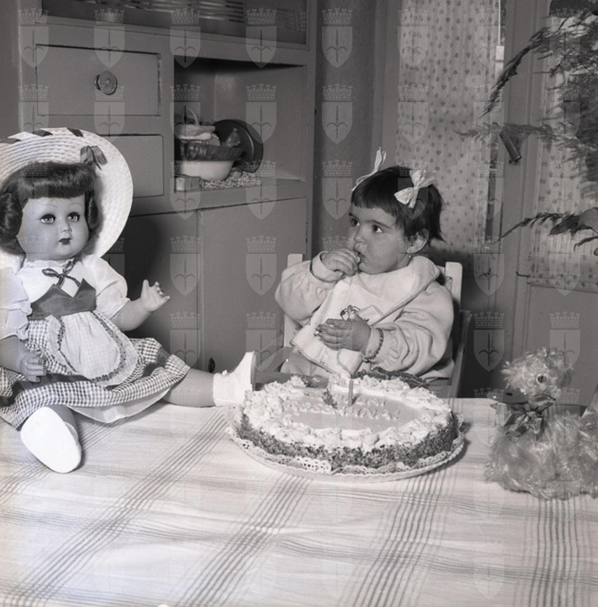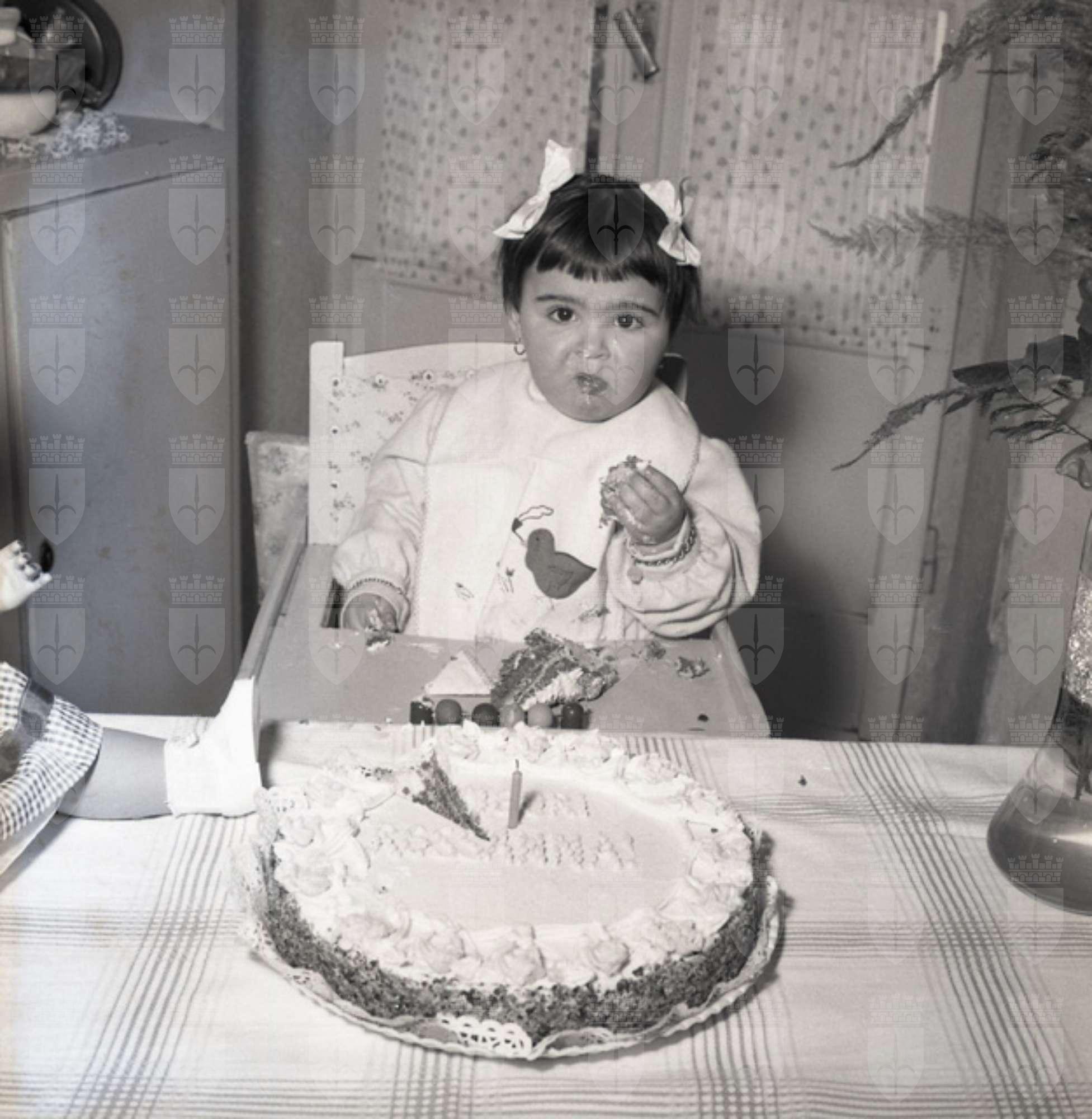 La bambina, che compie un anno, è seduta sul seggiolone: ha due fiocchetti sui capelli e porta gli orecchini.Sul tavolo sono disposti da sinistra a destra: una bambola, la torta con la candelina e un'anatra di peluche.