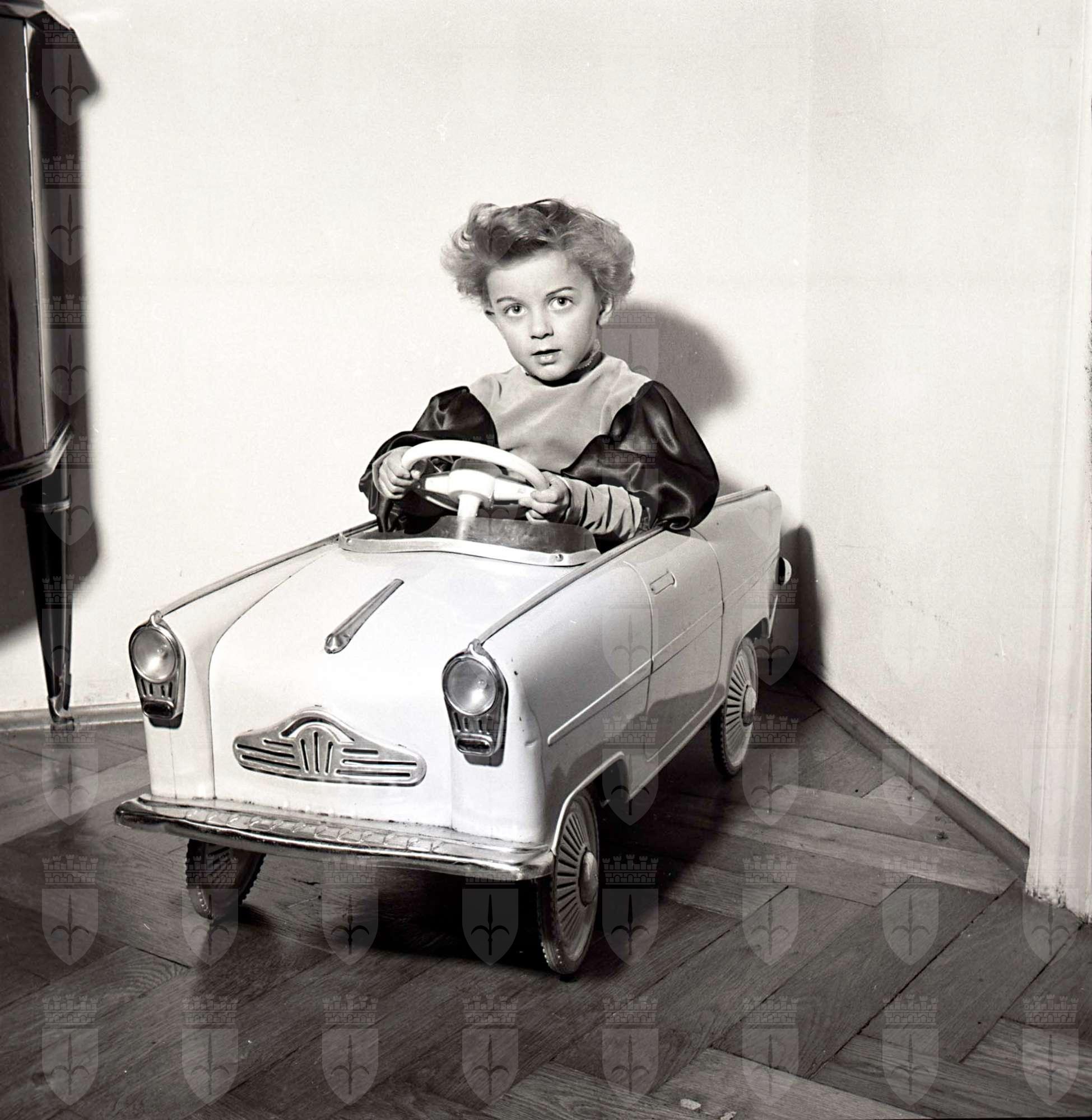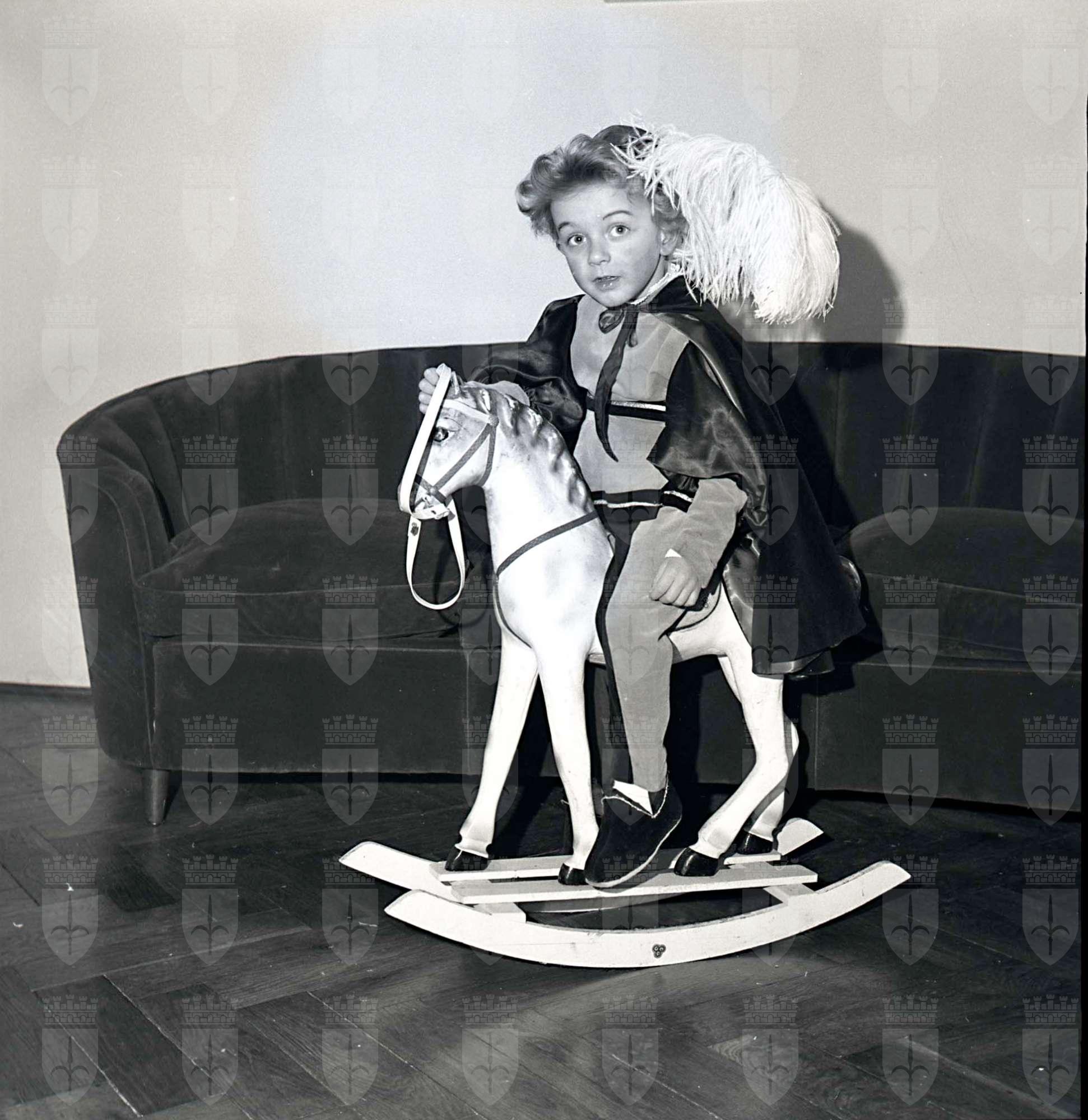 Bambino vestito da principe su cavallo a dondolo e su automobile giocattolo