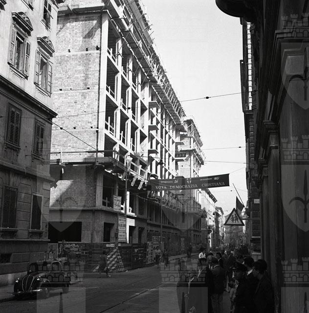 Dalla strada si vede uno striscione che invita a votare Democrazia Cristiana