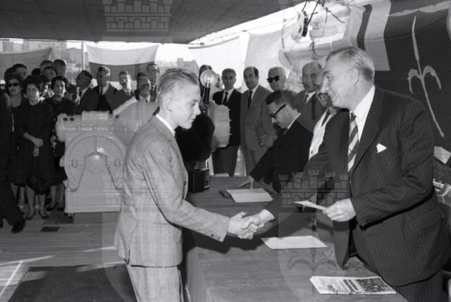 A bordo della motonave Europa, il presidente del Lloyd Triestino, amm. Capponi, consegna le borse di studio assegnate dalla Società.
