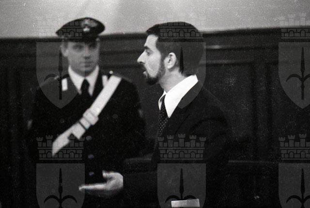 Processo (un imputato con barba e simbolo “doppia scure” in tasca