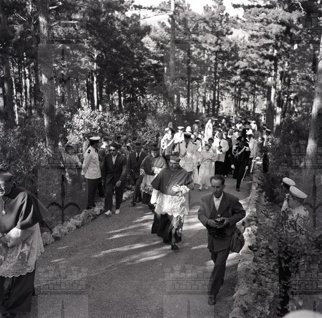 Il cardinale Lercaro, assistito dai monsignori Rovis e Dagri, benedice la pietra carsica durante il rito della sua consacrazione celebrata sul Monte Grisa, dove sorgerà il Tempio Mariano. Il cardinale Lercaro giunge a Trieste con il cardinale Urbani.