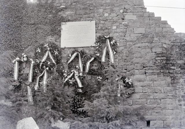 Depositate corone di fiori sulla targa a ricordo dell'irredentista mazziniano Gabriele Foschiatti, a nove anni dalla morte avvenuta il 20 novembre 1944 nel lager di Dachau