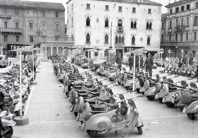 Decine di vespe in fila divise per città di provenienza in Piazza XX Settembre a Udine