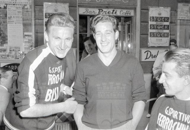 Gli atleti del gruppo sportivo Ferro-China Bisleri davanti al Bar Preti e all'emporio dell'automobile Goretti & Gervasi