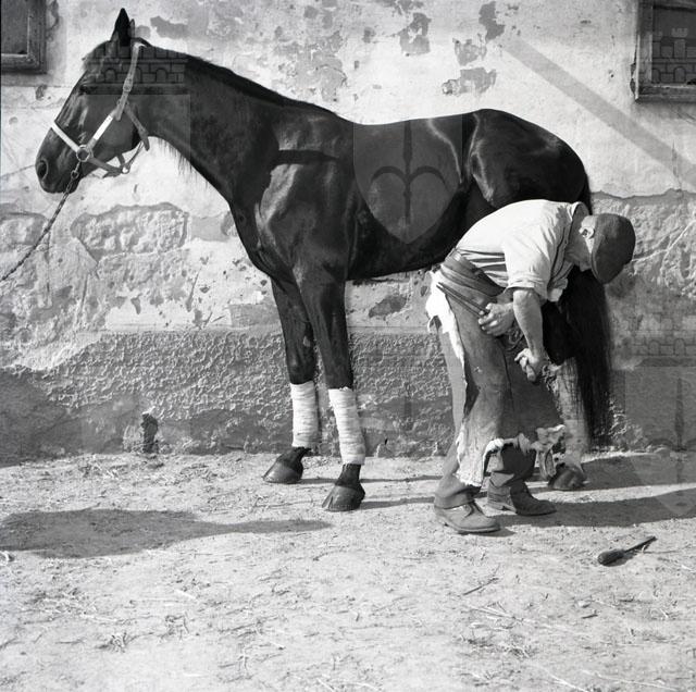 Un maniscalco intento a pareggiare o ferrare gli zoccoli di un cavallo