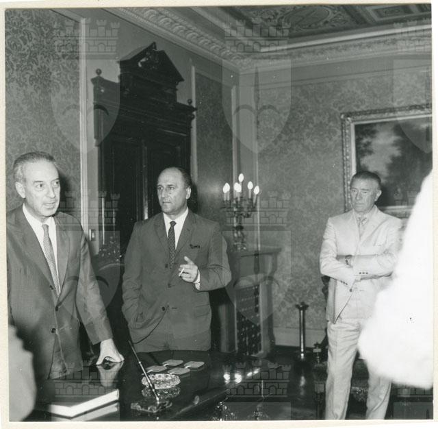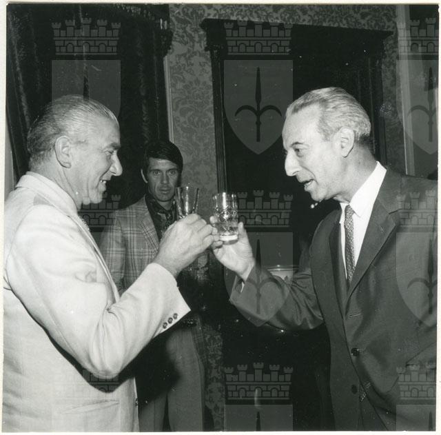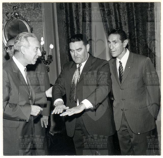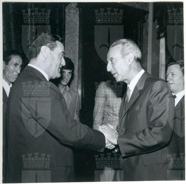 Il Sindaco ing. Spaccini riceve l'ospite accompagnato da Valcareggi, Maldini, Rivera