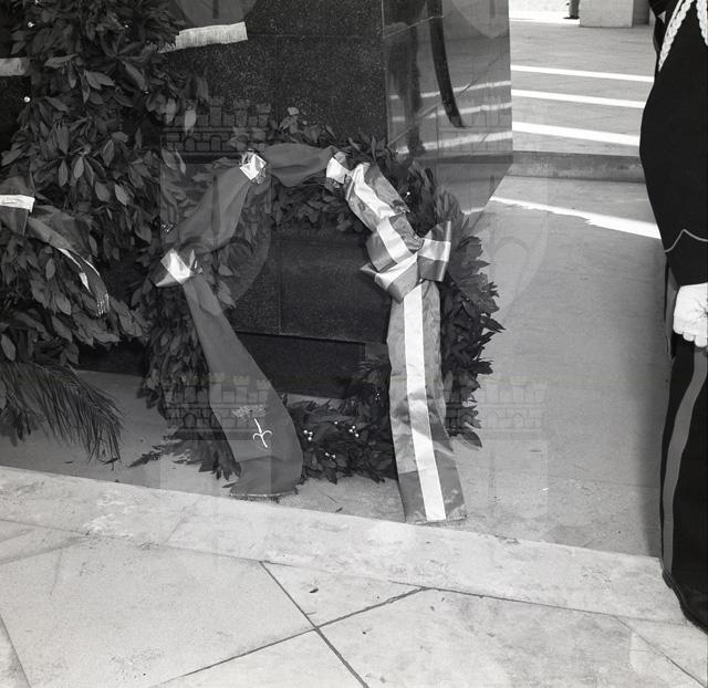 Folla presenzia alla cerimonia di inaugurazione dell'Ara Pacis Mundi di Medea. Cartellone sul muro di una casa: Sottocentro fecondazione artificiale. Uomo al volante di un'automobile