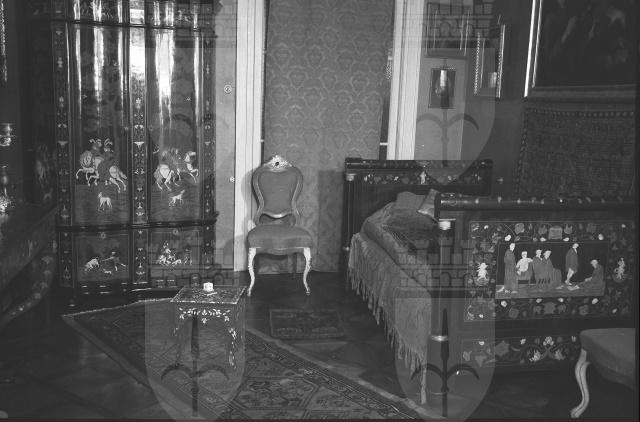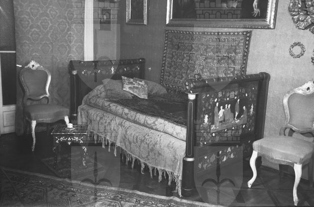 La splendida camera da letto di Draga Obrenovic, regina di Serbia, moglie del re Alessandro, composta da mobili olandesi intarsiati d'avorio. Draga e Alessandro, convolati a nozze nel 1900, furono assassinati la notte del 10 giugno 1903, proprio in questo letto: una congiura di palazzo pose fine alla dinastia degli Obrenovic, per insediare sul trono Pietro Karageorgevic. La camera appartenne a una nobile famiglia triestina e fu poi venduta a un celebre antiquario che la riallesti in una villa di viale Terza Armata, dove fu fotografata.