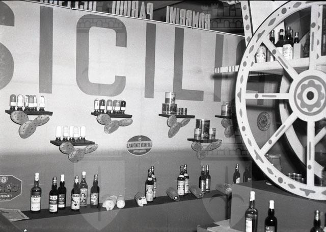 Riprese di uno stand di prodotti siciliani allestito con il tipico carretto, dello stand della Lykes Lines e del chiosco della Stock