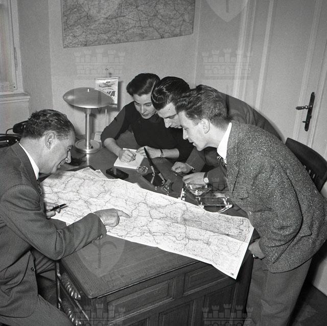 Servizio dedicato al personale dell'UTAT, agenzia di viaggi: gli impiegati posano per la fotografia, agli sportelli e negli uffici. Sulle lastre la vetrina dell'agenzia ricorda il ventennale di attività