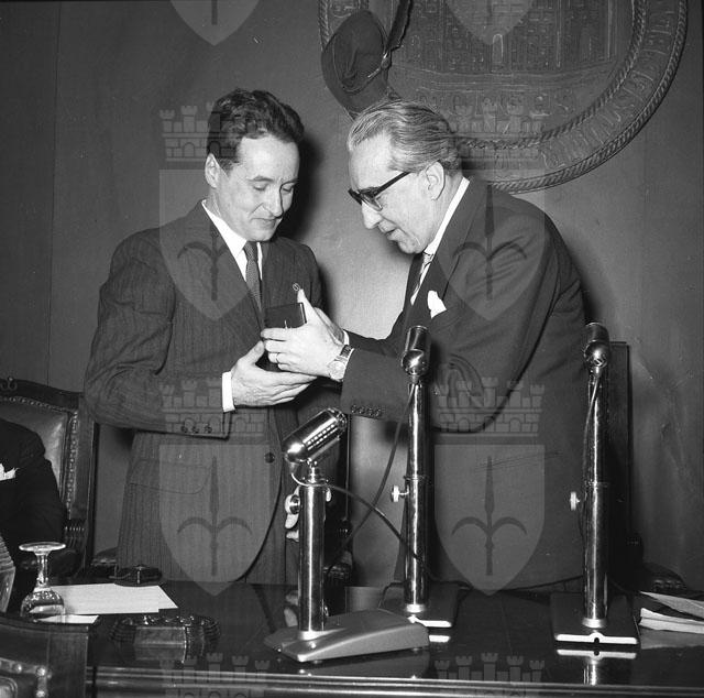 Il capitano Guido Musitelli, ufficiale triestino del 3. Reggimento artiglieria alpina della Julia, rientrato a casa dopo dodici anni di prigionia in Russia, viene ricevuto dal sindaco Bartoli