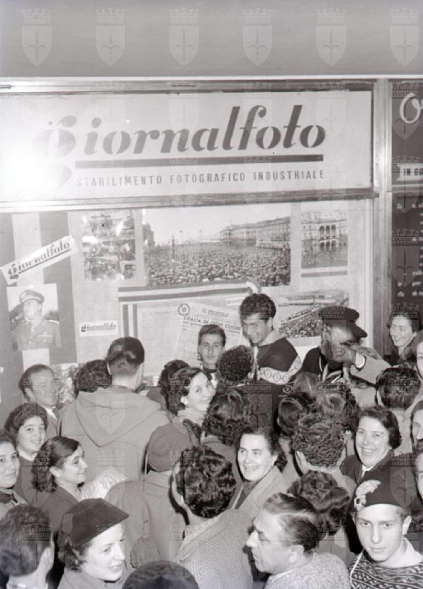 In Galleria Rossoni, la gente si accalca davanti alle vetrine di Giornalfoto che espongono le fotografie degli avvenimenti del giorno precedente, con l'arrivo delle truppe italiane a Trieste.