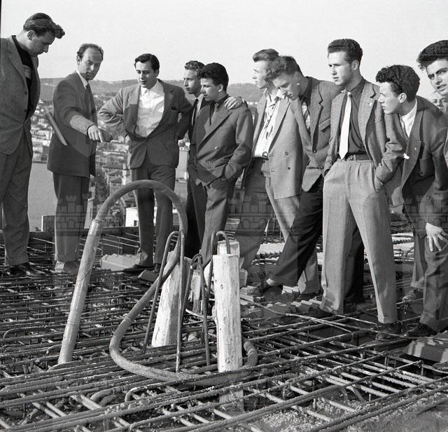 Gli studenti dell'Istituto tecnico industriale Alessandro Volta visitano la sede provinciale INAIL, di via del Teatro Romano, in costruzione. L'edificio, concluso nel 1957, è opera dell'arch. Romano Boico.